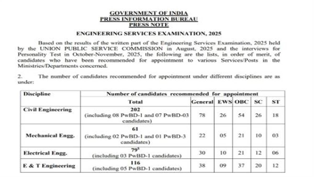 ਵੱਖ-ਵੱਖ ਇੰਜੀਨੀਅਰਿੰਗ ਸੇਵਾਵਾਂ ਲਈ 458 ਉਮੀਦਵਾਰਾਂ ਦੀ ਨਿਯੁਕਤੀ ਦੀ ਸਿਫ਼ਾਰਸ਼ ਕੀਤੀ ਗਈ ਹੈ। ਇਹ ਨਤੀਜੇ ਅਗਸਤ ’ਚ ਕਰਵਾਈ ਲਿਖਤੀ ਪ੍ਰੀਖਿਆ ਤੇ ਅਕਤੂਬਰ-ਨਵੰਬਰ ’ਚ ਕਰਵਾਈ ਵਿਅਕਤੀਤਵ ਜਾਂਚ ’ਤੇ ਆਧਾਰਿਤ ਹਨ। ਸਿਵਲ ਇੰਜੀਨੀਅਰਿੰਗ ਦੇ 202 ਉਮੀਦਵਾਰਾਂ ਦੀ ਨਿਯੁਕਤੀ ਦੀ ਸਿਫ਼ਾਰਸ਼ ਕੀਤੀ ਗਈ ਹੈ। ਇਲੈਕਟ੍ਰਾਨਿਕਸ ਤੇ ਟੈਲੀਕਮਿਊਨੀਕੇਸ਼ਨ ਦੇ 116, ਇਲੈਕਟ੍ਰੀਕਲ ਦੇ 79 ਤੇ ਮੈਕਨੀਕਲ ਇੰਜੀਨੀਅਰਿੰਗ ਦੇ 61 ਉਮੀਦਵਾਰਾਂ ਦੀ ਸਿਫ਼ਾਰਸ਼ ਕੀਤੀ ਗਈ ਹੈ।