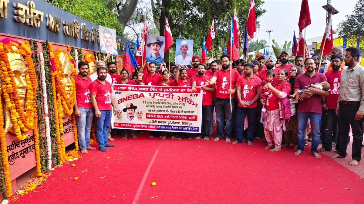 ਸਟਾਫ ਰਿਪੋਰਟਰ, ਪੰਜਾਬੀ ਜਾਗਰਣ, ਫਿਰੋਜ਼ਪੁਰ : ਸ਼ਹੀਦ-ਏ-ਆਜ਼ਮ ਭਗਤ ਸਿੰਘ, ਰਾਜਗੁਰੂ ਅਤੇ ਸੁਖਦੇਵ ਦੇ ਸ਼ਹੀਦੀ ਦਿਹਾੜੇ ਮੌਕੇ ਅੱਜ ਹੁਸੈਨੀਵਾਲਾ ਸ਼ਹੀਦੀ ਸਮਾਰਕ ਵਿਖੇ ‘ਸਰਬ ਭਾਰਤ ਨੌਜਵਾਨ ਸਭਾ’ ਤੇ ‘ਆਲ ਇੰਡੀਆ ਸਟੂਡੈਂਟਸ ਫੈਡਰੇਸ਼ਨ’ਵੱਲੋਂ ਭਾਰੀ ਇਕੱਠ ਕਰਕੇ ਸ਼ਹੀਦਾਂ ਨੂੰ ਸ਼ਰਧਾਂਜਲੀ ਭੇਂਟ ਕੀਤੀ ਗਈ। ਇਸ ਮੌਕੇ ‘ਬਨੇਗਾ ਪ੍ਰਾਪਤੀ ਮੁਹਿੰਮ’ ਦੇ ਬੈਨਰ ਹੇਠ ਸੈਂਕੜੇ ਨੌਜਵਾਨਾਂ ਅਤੇ ਵਿਦਿਆਰਥੀਆਂ ਨੇ ਸ਼ਹੀਦ ਭਗਤ ਸਿੰਘ ਦੀ ਫੋਟੋ ਵਾਲੀਆਂ ਵਿਸ਼ੇਸ਼ ਟੀ-ਸ਼ਰਟਾਂ ਪਹਿਨ ਕੇ ਇੱਕ ਵਿਸ਼ਾਲ ‘ਮਨੁੱਖੀ ਕੜੀ’ ਬਣਾਈ, ਜੋ ਖਿੱਚ ਦਾ ਕੇਂਦਰ ਰਹੀ। ਮੁਹਿੰਮ ਦੇ ਮੁੱਖ ਸਲਾਹਕਾਰ ਕਾਮਰੇਡ ਜਗਰੂਪ ਸਿੰਘ ਅਤੇ ਨੌਜਵਾਨ ਆਗੂਆਂ ਕਰਮਵੀਰ ਕੌਰ ਬੱਧਣੀ ਤੇ ਰਮਨ ਕੁਮਾਰ ਧਰਮੂਵਾਲਾ ਨੇ ਸੰਬੋਧਨ ਕਰਦਿਆਂ ਕਿਹਾ ਕਿ ਸ਼ਹੀਦ ਭਗਤ ਸਿੰਘ ਦੀ ਵਿਚਾਰਧਾਰਾ ਅੱਜ ਵੀ ਨੌਜਵਾਨੀ ਲਈ ਮਾਰਗਦਰਸ਼ਕ ਹੈ। ਉਨ੍ਹਾਂ ਦੱਸਿਆ ਕਿ 2014 ਵਿੱਚ ਇਸੇ ਪਵਿੱਤਰ ਸਥਾਨ ਤੋਂ 'ਭਗਤ ਸਿੰਘ ਕੌਮੀ ਰੁਜ਼ਗਾਰ ਗਰੰਟੀ ਕਾਨੂੰਨ' (ਬਨੇਗਾ) ਪਾਸ ਕਰਵਾਉਣ ਲਈ ਸੰਘਰਸ਼ ਸ਼ੁਰੂ ਕੀਤਾ ਗਿਆ ਸੀ, ਜੋ ਅੱਜ ਕੰਨਿਆਕੁਮਾਰੀ ਤੋਂ ਕਸ਼ਮੀਰ ਤੱਕ ਫੈਲ ਚੁੱਕਾ ਹੈ। ਆਗੂਆਂ ਨੇ ਚਿੰਤਾ ਪ੍ਰਗਟਾਈ ਕਿ ਅਜੋਕੇ ਦੌਰ ਵਿੱਚ ਆਰਟੀਫੀਸ਼ੀਅਲ ਇੰਟੈਲੀਜੈਂਸ ਕਾਰਨ ਰੁਜ਼ਗਾਰ ਦੇ ਮੌਕੇ ਪ੍ਰਭਾਵਿਤ ਹੋ ਰਹੇ ਹਨ। ਅਜਿਹੇ ਵਿਚ ‘ਬਨੇਗਾ’ ਕਾਨੂੰਨ ਲਾਗੂ ਕਰਨਾ ਅਤੇ ਕੰਮ ਦੇ ਘੰਟੇ 8 ਤੋਂ ਘਟਾ ਕੇ 6 ਕਰਨਾ ਹੀ ਇੱਕੋ-ਇੱਕ ਸਿਧਾਂਤਕ ਹੱਲ ਹੈ।ਸੂਬਾ ਸਕੱਤਰ ਚਰਨਜੀਤ ਛਾਂਗਾ ਰਾਏ ਅਤੇ ਸੁਖਵਿੰਦਰ ਮਲੋਟ ਨੇ ਵੱਡਾ ਐਲਾਨ ਕਰਦਿਆਂ ਕਿਹਾ ਕਿ ਰੁਜ਼ਗਾਰ ਦੀ ਗਰੰਟੀ, ਮੁਫ਼ਤ ਸਿੱਖਿਆ ਅਤੇ ਸਿਹਤ ਸਹੂਲਤਾਂ ਦੀ ਮੰਗ ਨੂੰ ਲੈ ਕੇ ਅਗਾਮੀ ਵਿਧਾਨ ਸਭਾ ਸੈਸ਼ਨ ਦੌਰਾਨ ਹਜ਼ਾਰਾਂ ਦੀ ਗਿਣਤੀ ਵਿੱਚ ਨੌਜਵਾਨ ‘ਵਿਧਾਨ ਸਭਾ ਮਾਰਚ’ ਕਰਨਗੇ। ਇਸ ਮੌਕੇ ਕੁਲਦੀਪ ਭੋਲਾ, ਵਿਸ਼ਾਲ ਵਲਟੋਹਾ, ਰਮਨਦੀਪ ਕੌਰ ਮੁਕਤਸਰ ਸਮੇਤ ਕਈ ਹੋਰ ਆਗੂਆਂ ਨੇ ਵੀ ਸ਼ਹੀਦਾਂ ਦੇ ਸੁਪਨਿਆਂ ਦਾ ਸਮਾਜ ਸਿਰਜਣ ਲਈ ਨੌਜਵਾਨਾਂ ਨੂੰ ਲਾਮਬੰਦ ਹੋਣ ਦਾ ਸੱਦਾ ਦਿੱਤਾ।