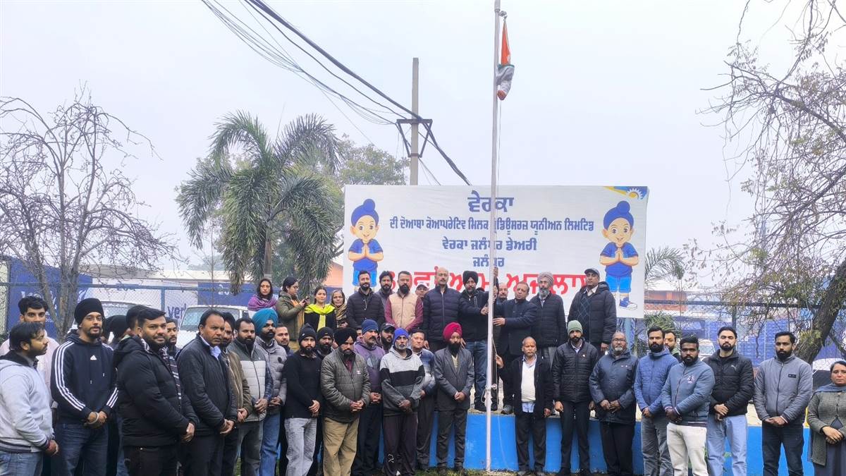 ਦੁਆਬਾ ਵੇਰਕਾ ਮਿਲਕ ਪਲਾਂਟ ’ਚ ਚੇਅਰਮੈਨ ਰਮੇਸ਼ਵਰ ਸਿੰਘ ਸਰਾਏ ਤੇ ਜੀਐੱਮ ਸੰਜੀਵ ਸ਼ਰਮਾ ਦੀ ਅਗਵਾਈ ਹੇਠ ਸਮੂਹ ਦੁਆਬਾ ਵੇਰਕਾ ਮਿਲਕ ਪਲਾਂਟ ਮੁਲਾਜ਼ਮਾਂ ਵੱਲੋਂ ਗਣਤੰਤਰ ਦਿਵਸ ਮੌਕੇ ਸੇਲਜ਼ ਮੈਨੇਜਰ ਪੀਕੇ ਯਾਦਵ ਵੱਲੋਂ ਨਾਲ ਮਿਲ ਕੇ ਝੰਡਾ ਲਹਿਰਾਉਣ ਦੀ ਰਸਮ ਨਿਭਾ ਕੇ ਰਾਸ਼ਟਰੀ ਝੰਡੇ ਨੂੰ ਸਲਾਮੀ ਦਿੱਤੀ ਗਈ। ਇਸ ਮੌਕੇ ਦੁਆਬਾ ਮਿਲਕ ਪਲਾਂਟ ਇੰਪਲਾਈਜ਼ ਯੂਨੀਅਨ ਦੇ ਪ੍ਰਧਾਨ ਪਵਨ ਪਾਸੀ ਤੇ ਯੂਨੀਅਨ ਮੈਂਬਰ ਹਾਜ਼ਰ ਸਨ। ਵੇਰਵਾ : ਅਮਰਜੀਤ ਸਿੰਘ ਵੇਹਗਲ, ਪੰਜਾਬੀ ਜਾਗਰਣ, ਜਲੰਧਰ।