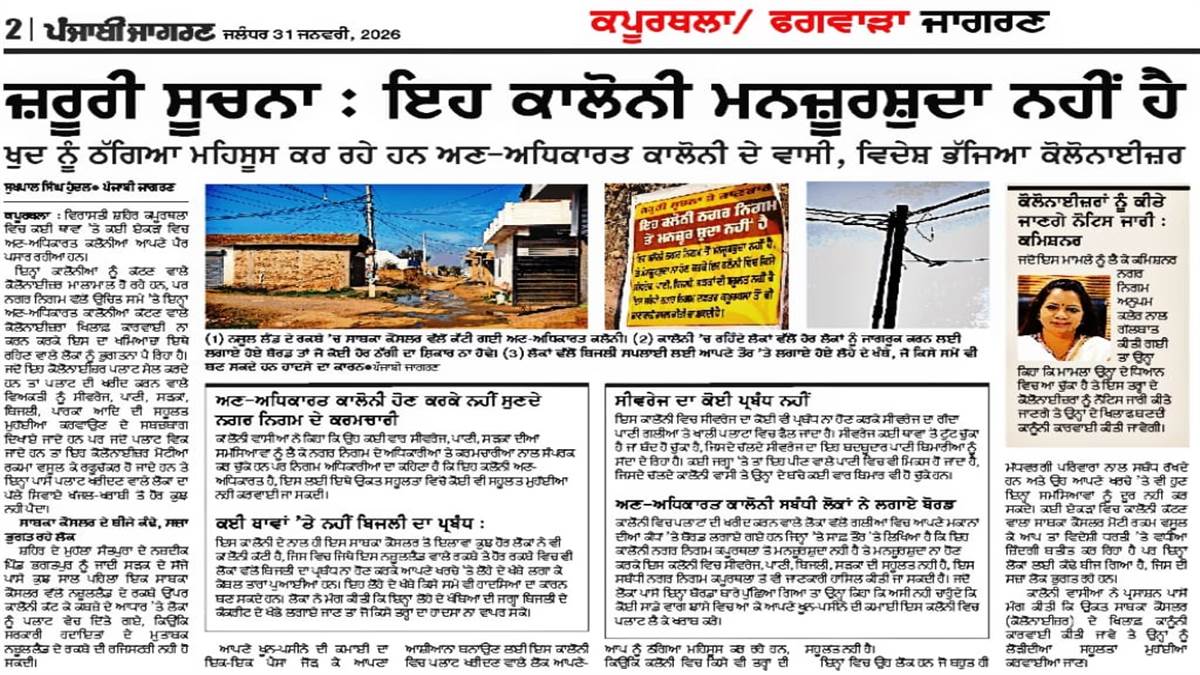 --ਨੋਟਿਸ ਲਗਾ ਕੇ ਰੋਕਿਆ ਕਮਰਸ਼ੀਅਲ ਬਿਲਡਿੰਗ ਦਾ ਚੱਲ ਰਿਹਾ ਕੰਮ --ਪੰਜਾਬੀ ਜਾਗਰਣ ਵੱਲੋਂ ਪ੍ਰਮੁਖਤਾ ਨਾਲ ਛਾਪਿਆ ਗਿਆ ਸੀ ਇਹ ਮੁੱਦਾ ਸੁਖਪਾਲ ਸਿੰਘ ਹੁੰਦਲ, ਪੰਜਾਬੀ ਜਾਗਰਣ ਕਪੂਰਥਲਾ : ਸ਼ਹਿਰ ਵਿਚ ਵੱਡੇ ਪੱਧਰ ’ਤੇ ਕੱਟੀਆਂ ਗਈਆਂ ਅਣ-ਅਧਿਕਾਰਤ ਕਾਲੋਨੀਆਂ ਦੇ ਕੋਲੋਨਾਈਜ਼ਰਾਂ ਵੱਲੋਂ ਜਿਥੇ ਨਗਰ ਨਿਗਮ ਨੂੰ ਬਣਦੀ ਫੀਸ ਜਮਾਂ ਨਾ ਕਰਵਾ ਕੇ ਲੱਖਾਂ ਰੁਪਏ ਦਾ ਚੂਨਾ ਲਗਾਇਆ ਗਿਆ ਹੈ। ਇਸੇ ਤਰ੍ਹਾਂ ਦੀ ਇਕ ਕਲੋਨੀ ਮੁਹੱਲਾ ਸੰਤਪੁਰਾ ਦੇ ਨਜ਼ਦੀਕ ਕੱਟੀ ਗਈ ਹੈ। ਇਹ ਕਾਲੋਨੀ ਭਾਵੇਂ ਅਣ-ਅਧਿਕਾਰਤ ਹੈ ਪਰ ਇਥੇ ਪਲਾਟ ਲੈਣ ਵਾਲੇ ਲੋਕਾਂ ਵੱਲੋਂ ਨਗਰ ਨਿਗਮ ਤੋਂ ਐੱਨਓਸੀ ਤੇ ਨਕਸ਼ੇ ਪਾਸ ਕਰਵਾ ਕੇ ਰਿਹਾਇਸ਼ੀ ਮਕਾਨ ਬਣਾਏ ਹੋਏ ਹਨ ਤੇ ਕਾਫੀ ਹੱਦ ਤੱਕ ਕਾਲੋਨੀ ਵਿਚ ਵਸੋਂ ਹੋ ਚੁੱਕੀ ਹੈ। ਇਸ ਕਲੋਨੀ ਵਿਚ ਮਕਾਨ ਬਣਾਉਣ ਵਾਲੇ ਲੋਕਾਂ ਵੱਲੋਂ ਨਗਰ ਨਿਗਮ ਨੂੰ ਲੱਖਾਂ ਰੁਪਏ ਨਕਸ਼ੇ ਪਾਸ ਕਰਵਾਉਣ ਤੇ ਐੱਨਓਸੀ ਲੈਣ ਸਮੇਂ ਫੀਸ ਭਰੀ ਗਈ ਪਰ ਇਸ ਦੇ ਬਾਵਜੂਦ ਵੀ ਇਹ ਲੋਕ ਮੁਢਲੀਆਂ ਸਹੂਲਤਾਂ ਜਿਵੇਂ ਸੀਵਰੇਜ, ਸੜਕਾਂ ਤੇ ਪਾਣੀ ਦੀ ਸਹੂਲਤ ਤੋ ਵਾਂਝੇ ਹਨ। ਜਦੋਂ ਇਥੇ ਰਹਿੰਦੇ ਲੋਕਾਂ ਵੱਲੋਂ ਨਗਰ ਨਿਗਮ ਦੇ ਅਧਿਕਾਰੀਆਂ ਤੋਂ ਸੜਕਾਂ, ਸੀਵਰੇਜ ਬਣਾਉਣ ਦੀ ਮੰਗ ਕੀਤੀ ਜਾਂਦੀ ਹੈ ਤਾਂ ਅਧਿਕਾਰੀਆਂ ਦਾ ਕਹਿਣਾ ਹੁੰਦਾ ਹੈ ਇਹ ਕਾਲੋਨੀ ਅਣ-ਅਧਿਕਾਰਤ ਹੈ, ਇਸ ਲਈ ਉਨ੍ਹਾਂ ਨੂੰ ਨਿਗਮ ਵੱਲੋਂ ਇਹ ਸਹੂਲਤਾਂ ਨਹੀਂ ਦਿੱਤੀਆਂ ਜਾ ਸਕਦੀਆਂ। ਇਸ ਸਬੰਧੀ ਪੰਜਾਬੀ ਜਾਗਰਣ ਵੱਲੋਂ ਆਪਣੇ 31 ਜਨਵਰੀ ਦੇ ਅੰਕ ਵਿਚ ਇਨ੍ਹਾਂ ਕਾਲੋਨੀਆਂ ਦੀ ਖਬਰ ਨੂੰ ਪ੍ਰਮੁੱਖਤਾ ਨਾਲ ਛਾਪਿਆ ਗਿਆ ਸੀ, ਜਿਸ ’ਤੇ ਇਹ ਮਾਮਲਾ ਕਮਿਸ਼ਨਰ ਨਗਰ ਨਿਗਮ ਅਨੁਪਮ ਕਲੇਰ ਆਈਏਐੱਸ ਦੇ ਧਿਆਨ ਵਿਚ ਆਉਣ ਤੋਂ ਬਾਅਦ ਨਗਰ ਨਿਗਮ ਦੀ ਬਿਲਡਿੰਗ ਬਰਾਂਚ ਦੇ ਅਧਿਕਾਰੀਆਂ ਤੇ ਕਰਮਚਾਰੀਆਂ ਵੱਲੋਂ ਇਸ ਕਾਲੋਨੀ ਦਾ ਮੌਕਾ ਮੁਆਇਨਾ ਕੀਤਾ ਗਿਆ। ਇਸ ਕਾਲੋਨੀ ਵਿਚ ਹੋ ਰਹੀਆਂ ਉਸਾਰੀਆਂ ਦੀ ਚੈਕਿੰਗ ਦੌਰਾਨ ਬਣ ਰਹੀ ਇਕ ਕਮਰਸ਼ੀਅਲ ਬਿਲਡਿੰਗ (ਫੈਕਟਰੀ) ਦੇ ਕੰਮ ਨੂੰ ਰੋਕਦੇ ਹੋਏ ਉਸ ਦੇ ਬਾਹਰ ਨੋਟਿਸ ਲਗਾ ਕੇ ਬਿਲਡਿੰਗ ਦੇ ਮਾਲਕ ਨੂੰ ਤਿੰਨ ਦਿਨਾਂ ਦੇ ਅੰਦਰ-ਅੰਦਰ ਦਸਤਾਵੇਜ਼ ਨਗਰ ਨਿਗਮ ਦੇ ਦਫਤਰ ਵਿਚ ਪੇਸ਼ ਕਰਨ ਨੂੰ ਕਿਹਾ ਗਿਆ। ਕਾਲੋਨੀ ਵਾਸੀਆਂ ਦਾ ਕਹਿਣਾ ਹੈ ਕਿ ਇਸ ਕਾਲੋਨੀ ’ਚ ਸੜਕਾਂ ਤੇ ਸੀਵਰੇਜ ਪਹਿਲਾਂ ਹੀ ਟੁੱਟਿਆ ਪਿਆ ਹੈ, ਜੇਕਰ ਇਸ ਆਬਾਦੀ ਵਾਲੇ ਖੇਤਰ ਵਿਚ ਫੈਕਟਰੀ ਲੱਗਦੀ ਹੈ ਤਾਂ ਉਨ੍ਹਾਂ ਨੂੰ ਹੋਰ ਵੀ ਸਮੱਸਿਆ ਦਾ ਸਾਹਮਣਾ ਕਰਨਾ ਪਵੇਗਾ। ਉਨ੍ਹਾਂ ਦਾ ਕਹਿਣਾ ਹੈ ਕਿ ਫੈਕਟਰੀ ਲੱਗਣ ਦੇ ਨਾਲ ਕਾਲੋਨੀ ਵਿਚ ਵੱਡੇ ਕਮਰਸ਼ੀਅਲ ਵਾਹਨਾਂ ਦੀ ਆਵਾਜਾਈ ਰਹੇਗੀ ਤੇ ਕਲੋਨੀ ਦੀਆਂ ਗਲੀਆਂ ਵਿਚ ਖੇਡਦੇ ਛੋਟੇ ਬੱਚਿਆਂ ਦੀ ਜਾਨ ਨੂੰ ਖਤਰਾ ਬਣਿਆ ਰਹੇਗਾ। ਇਸ ਲਈ ਉਨ੍ਹਾਂ ਪ੍ਰਸ਼ਾਸਨ ਤੋਂ ਮੰਗ ਕੀਤੀ ਕਿ ਕਾਲੋਨੀ ਵਿਚ ਕਿਸੇ ਵੀ ਤਰ੍ਹਾਂ ਦੀ ਇੰਡਸਟਰੀ, ਫੈਕਟਰੀ ਆਦਿ ਨਾ ਲੱਗਣ ਦਿੱਤੀ ਜਾਵੇ। ਨਕਸ਼ਾ ਪਾਸ ਕਰਵਾਉਂਦੇ ਹਨ ਘਰ ਦਾ, ਬਣਾਉਂਦੇ ਹਨ ਕਮਰਸ਼ੀਅਲ ਬਿਲਡਿੰਗ ਜ਼ਿਕਰਯੋਗ ਹੈ ਕਿ ਇਸ ਕਾਲੋਨੀ ਤੋਂ ਇਲਾਵਾ ਹੋਰ ਵੀ ਕਈ ਥਾਵਾਂ ’ਤੇ ਬਿਨਾਂ ਨਕਸ਼ਾ ਪਾਸ ਕਰਾਏ ਬਿਲਡਿੰਗਾਂ ਬਣ ਰਹੀਆਂ ਹਨ। ਇਹ ਬਿਲਡਿੰਗਾਂ ਬਣਾਉਣ ਵਾਲੇ ਸਰਕਾਰ ਨੂੰ ਲੱਖਾ ਦਾ ਚੂਨਾ ਲਗਾਉਂਦੇ ਹਨ। ਦੱਸਣਯੋਗ ਹੈ ਕਿ ਨਗਰ ਨਿਗਮ ਦੇ ਕੁਝ ਕਥਿਤ ਅਧਿਕਾਰੀਆਂ ਤੇ ਕਰਮਚਾਰੀਆਂ ਦੀ ਮਿਲੀਭੁਗਤ ਦੇ ਚਲਦੇ ਚੋਰ ਮੋਰੀ ਰਾਹੀਂ ਨਕਸ਼ਾ ਤਾਂ ਘਰ ਦਾ ਪਾਸ ਕਰਵਾਇਆ ਜਾਂਦਾ ਹੈ ਪਰ ਬਿਲਡਿੰਗ ਕਮਰਸ਼ੀਅਲ ਬਣਾ ਲਈ ਜਾਂਦੀ ਹੈ, ਜਿਸ ਦਾ ਖਮਿਆਜ਼ਾ ਆਲੇ-ਦੁਆਲੇ ਰਹਿ