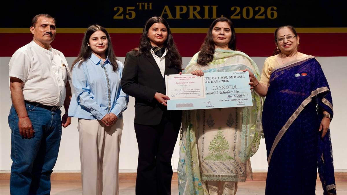 ਆਰਮੀ ਇੰਸਟੀਚਿਊਟ ਆਫ ਲਾਅ ਮੁਹਾਲੀ ਦੀ ਵਿਦਿਆਰਥਣ ਪਲਵੀ ਜਸਰੋਤੀਆ ਨੂੰ ਆਪਣੇ ਪਿਤਾ ਸਵ. ਕੇਵਲ ਕ੍ਰਿਸ਼ਨ ਕਪਿਲਾ ਦੀ ਯਾਦ ਵਿਚ ਸ਼ੁਰੂ ਕੀਤੀ ਕੇਕੇ ਕਪਿਲਾ ਮੈਮੋਰੀਅਲ ਸਕਾਲਰਸ਼ਿੱਪ ਪ੍ਰਦਾਨ ਕਰਨ ਸਮੇਂ ਅਹਿਸਾਸ ਚੈਰੀਟੇਬਲ ਆਰਗੇਨਾਈਜੇਸ਼ਨ ਲੁਧਿਆਣਾ ਦੀ ਪ੍ਰਧਾਨ ਸੰਗੀਤਾ ਭੰਡਾਰੀ, ਰਾਜੇਸ਼ ਭੰਡਾਰੀ ਅਤੇ ਚਾਹਤ ਭੰਡਾਰੀ। ਫੋਟੋ ਅਤੇ ਵੇਰਵਾ ਪਲਵਿੰਦਰ ਸਿੰਘ ਢੁੱਡੀਕੇ, ਪੰਜਾਬੀ ਜਾਗਰਣ ਲੁਧਿਆਣਾ