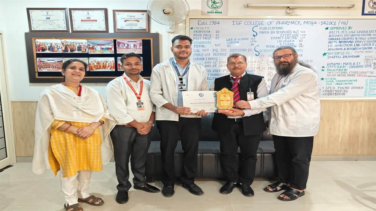 ਪੱਤਰ ਪ੍ਰੇਰਕ ਪੰਜਾਬੀ ਜਾਗਰਣ, ਮੋਗਾ : ਰਾਜ ਦੀ ਪ੍ਰਮੁੱਖ ਵਿਦਿਅਕ ਸੰਸਥਾ ਆਈਐੱਸਐੱਫ ਕਾਲਜ ਆਫ਼ ਫਾਰਮੇਸੀ ਦੇ ਐੱਮ ਫਾਰਮ ਦੇ ਅੰਤਿਮ ਸਾਲ ਦੇ ਵਿਦਿਆਰਥੀ ਰਾਜੀਵ ਰੰਜਨ ਨੇ ਇੱਕ ਅੰਤਰਰਾਸ਼ਟਰੀ ਕਾਨਫਰੰਸ ਵਿਚ ਮੌਖਿਕ ਪੇਸ਼ਕਾਰੀ ਵਿਚ ਪਹਿਲਾ ਸਥਾਨ ਪ੍ਰਾਪਤ ਕਰਕੇ ਸੰਸਥਾ ਦਾ ਨਾਮ ਰੌਸ਼ਨ ਕੀਤਾ ਹੈ। ਇਹ ਅੰਤਰਰਾਸ਼ਟਰੀ ਕਾਨਫਰੰਸ ਪਠਾਨਕੋਟ ਦੇ ਬਧਾਨੀ ਸਥਿਤ ਸ਼੍ਰੀ ਸਾਈਂ ਕਾਲਜ ਆਫ਼ ਫਾਰਮੇਸੀ ਵਿਖੇ ਆਯੋਜਿਤ ਕੀਤੀ ਗਈ ਸੀ। ਵਿਦਿਆਰਥੀ ਰਾਜੀਵ ਰੰਜਨ ਡਾ. ਰਵੀ ਰਾਜਪਾਲ ਦੀ ਨਿਗਰਾਨੀ ਹੇਠ ਆਪਣਾ ਖੋਜ ਕਾਰਜ ਕਰ ਰਿਹਾ ਹੈ। ਇਸ ਅੰਤਰਰਾਸ਼ਟਰੀ ਕਾਨਫਰੰਸ ਵਿਚ ਇਕ ਹਜ਼ਾਰ ਤੋਂ ਵੱਧ ਅਧਿਆਪਕਾਂ, ਵਿਦਿਆਰਥੀਆਂ ਅਤੇ ਖੋਜਕਰਤਾਵਾਂ ਨੇ ਹਿੱਸਾ ਲਿਆ। ਇਸ ਪ੍ਰਾਪਤੀ ਤੇ ਵਿਦਿਆਰਥੀ ਰਾਜੀਵ ਰੰਜਨ ਅਤੇ ਉਨ੍ਹਾਂ ਦੇ ਗਾਈਡ, ਡਾ. ਰਵੀ ਰਾਜਪਾਲ ਨੂੰ ਸੰਸਥਾ ਦੇ ਚੇਅਰਮੈਨ ਪ੍ਰਵੀਨ ਗਰਗ, ਸਕੱਤਰ ਇੰਜੀਨੀਅਰ ਜਨੇਸ਼ ਗਰਗ, ਡਾ. ਮੁਸਕਾਨ ਗਰਗ, ਡਾਇਰੈਕਟਰ ਡਾ. ਜੀ.ਡੀ. ਗੁਪਤਾ, ਆਈਐਸਐਫਸੀਪੀਆਰ ਦੇ ਪ੍ਰਿੰਸੀਪਲ ਡਾ. ਆਰਕੇ ਨਾਰੰਗ, ਡੀਨ ਆਫ਼ ਐਗਜ਼ਾਮੀਨੇਸ਼ਨ ਇੰਜੀਨੀਅਰ ਜਸਪ੍ਰੀਤ ਇੰਦਰ ਸਿੰਘ, ਡੀਨ ਆਫ਼ ਸਟੂਡੈਂਟਸ ਡਾ. ਜੀਐੱਸ ਸ਼ਰਮਾ ਅਤੇ ਸਮੁੱਚੀ ਫੈਕਲਟੀ ਵੱਲੋਂ ਵਧਾਈਆਂ ਅਤੇ ਸ਼ੁਭਕਾਮਨਾਵਾਂ ਮਿਲੀਆਂ।