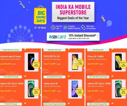 ਜੇਐੱਨਐੱਨ, ਨਵੀਂ ਦਿੱਲੀ: Flipkart ਵਲੋਂ ਹੋਲੀ ਦੇ ਖਾਸ ਮੌਕੇ 'ਤੇ Flipkart Big Saving Days ਦੀ ਸ਼ੁਰੂਆਤ ਕੀਤੀ ਗਈ ਹੈ। ਇਹ ਸੇਲ 12 ਮਾਰਚ ਤੋਂ ਸ਼ੁਰੂ ਹੋ ਗਈ ਹੈ ਤੇ 16 ਮਾਰਚ ਤਕ ਜਾਰੀ ਰਹੇਗੀ। ਇਸ ਸੇਲ 'ਚ ਗਾਹਕ Apple iPhone, Samsung, Realme ਤੇ Xiaomi ਦੇ ਸਮਾਰਟਫੋਨ ਸਸਤੇ 'ਚ ਖਰੀਦੇ ਸਕਣਗੇ। ਫੋਨ ਨੂੰ SBI ਕਾਰਡ ਤੋਂ ਖਰੀਦਣ 'ਤੇ 10 ਫੀਸਦੀ ਦਾ ਇੰਸਟੈਂਟ ਡਿਸਕਾਊਂਟ ਮਿਲੇਗਾ। ਇਸ ਦੇ ਨਾਲ ਹੀ ਕਈ ਹੋਰ ਵੀ ਆਫਰ ਦਿੱਤੇ ਜਾ ਰਹੇ ਹਨ।