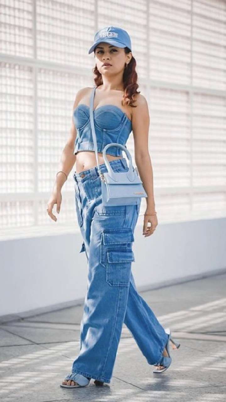 ਇਸ ਡੈਨਮ ਕ੍ਰੌਪ ਟਾਪ ਤੇ ਫਲੇਅਰਡ ਜੀਨਸ ਵਿੱਚ ਸਟਾਈਲਿਸ਼ ਲੱਗ ਰਹੀ ਹੈ। ਉਸਨੇ ਨੀਲੇ ਰੰਗ ਦੀ ਕੈਪ ਤੇ ਹੈਂਡ ਪਰਸ ਨਾਲ ਆਪਣੇ ਲੁੱਕ ਨੂੰ ਪੂਰਾ ਕੀਤਾ ਹੈ। ਉੱਚੀ ਅੱਡੀ ਉਸ ਦੀ ਲੁੱਕ ਵਧੀਆਂ ਬਣਾ ਰਹੀ ਹੈ।