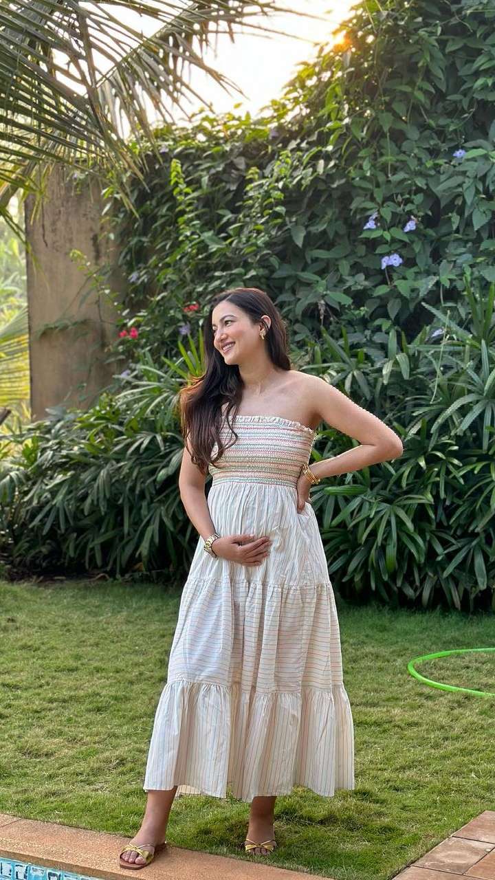 ਇਸ ਫੋਟੋ 'ਚ ਅਭਿਨੇਤਰੀ ਨੇ ਆਫ ਸ਼ੋਲਡਰ ਡਰੈੱਸ ਪਾਈ ਹੋਈ ਹੈ ਅਤੇ ਗੋਰਡਨ 'ਚ ਨਜ਼ਰ ਆ ਰਹੀ ਹੈ। ਇਸ ਤਸਵੀਰ 'ਚ ਅਦਾਕਾਰਾ ਆਪਣੇ ਪੇਟ 'ਤੇ ਹੱਥ ਰੱਖ ਰਹੀ ਹੈ ਅਤੇ ਮੁਸਕਰਾਉਂਦੀ ਨਜ਼ਰ ਆ ਰਹੀ ਹੈ।