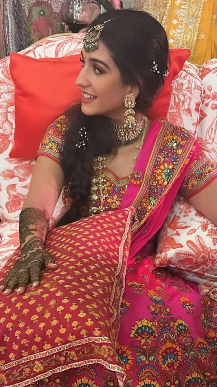 ਮਹਿੰਦੀ ਫੰਕਸ਼ਨ 'ਚ ਗੁਲਾਬੀ ਰੰਗ ਦਾ ਲਹਿੰਗਾ ਪਾਇਆ ਹੈ। ਰਾਧਿਕਾ ਦੇ ਲਹਿੰਗਾ 'ਤੇ ਮਲਟੀ ਥਰਿੱਡ ਵਰਕ ਕੀਤਾ ਗਿਆ ਹੈ ਅਤੇ ਮੈਚਿੰਗ ਚੋਲੀ ਪਹਿਨੀ ਹੋਈ ਹੈ ਦੁਪੱਟੇ 'ਤੇ ਮੈਚਿੰਗ ਕਢਾਈ ਵਾਲੀ ਬਾਰਡਰ ਵੀ ਨਜ਼ਰ ਆ ਰਹੀ ਹੈ।