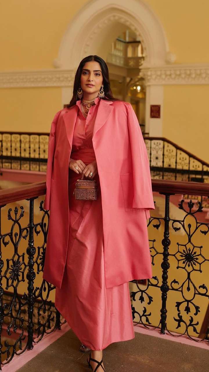 ਅਭਿਨੇਤਰੀ ਨੇ ਡਾਇਰ ਪੇਸਟਲ ਗੁਲਾਬੀ ਪਹਿਰਾਵੇ ਦੇ ਇੱਕ ਮੋਨੋਟੋਨ ਸ਼ੇਡ ਦੀ ਚੋਣ ਕੀਤੀ। ਸੋਨਮ ਇੱਕ ਮੇਲ ਖਾਂਦੇ ਬਲੇਜ਼ਰ ਦੇ ਨਾਲ ਇੱਕ ਬਟਨ-ਅੱਪ ਗੁਲਾਬੀ ਪਹਿਰਾਵੇ ਵਿੱਚ ਬਹੁਤ ਖੂਬਸੂਰਤ ਲੱਗ ਰਹੀ ਹੈ