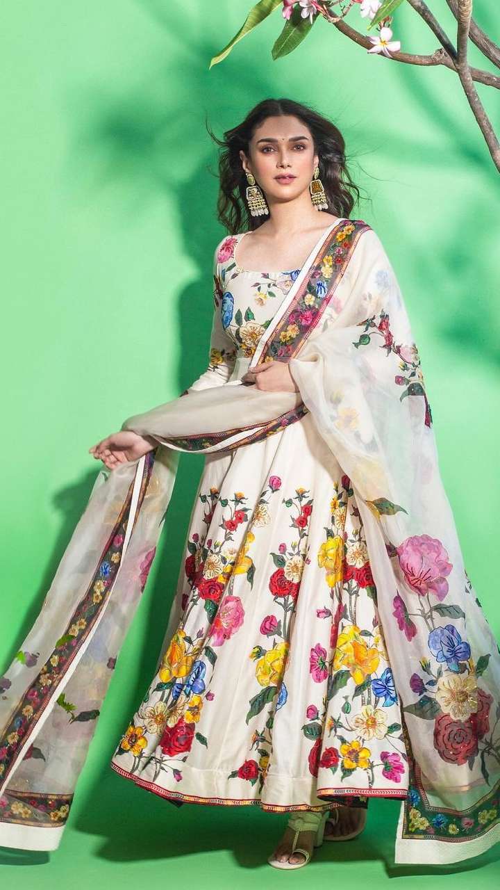 ਅਦਿਤੀ ਰਾਓ ਹੈਦਰੀ ਨੇ ਰੇਸ਼ਮ ਅਤੇ ਆਰਗੇਨਜ਼ਾ ਫੈਬਰਿਕ ਦਾ ਬਣਿਆ ਅਨਾਰਕਲੀ ਸੂਟ ਸਟਾਈਲ ਕੀਤਾ ਹੈ। ਜਿਸ ਵਿੱਚ ਰਾਜਸਥਾਨੀ ਪੈਟਰਨ ਨਾਲ ਫੁੱਲਾਂ ਦੀ ਕਢਾਈ ਕੀਤੀ ਗਈ ਹੈ।
