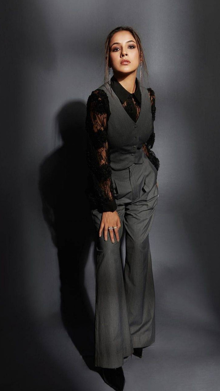 ਸ਼ਹਿਨਾਜ਼ ਨੇ ਕਾਲੇ ਰੰਗ ਦੇ ਨੈੱਟ ਟੌਪ ਨਾਲ ਗ੍ਰੇ ਫਾਰਮਲ ਸੂਟ ਪਾਇਆ ਹੈ। ਨਾਲ ਹੀ ਬੈਲੀ ਨਾਲ ਪੂਰੇ ਲੁੱਕ ਨੂੰ ਕੰਪਲੀਟ ਕੀਤਾ।