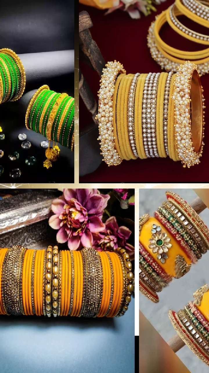 ਮੋਤੀ ਦੇ ਡਿਜ਼ਾਈਨ ਨੂੰ ਸਦਾਬਹਾਰ ਤਰਜੀਹ ਦਿੱਤੀ ਜਾਂਦੀ ਹੈ। ਇਸ ਤਰ੍ਹਾਂ ਦੇ ਮੋਤੀ ਵਰਕ ਬੈਂਗਲ ਨਾਲ ਡਿਜ਼ਾਈਨ ਕਰਕੇ ਪਲੇਨ ਯੈਲੋ ਕਲਰ ਦੀਆਂ ਚੂੜੀਆਂ ਨੂੰ ਆਸਾਨੀ ਨਾਲ ਪਹਿਨ ਸਕਦੇ ਹੋ।